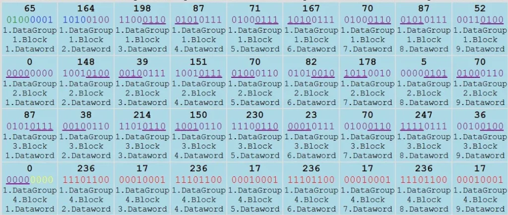 Wollen wir beispielsweise den Text „Besonders geistreicher Spruch!“ in der Version 4 und in der höchsten Fehlerkorrekturstufe als QR Code generieren, ist dabei die Bitsequenz auf 4 Nachrichtenpolynome 8. Grades aufzuteilen und dafür jeweils 16 Fehlerkorrekturcodes auszurechen. Durch diese Aufteilung sehen die Nachrichtenpolynome nahezu süß und harmlos aus, wie es das unten stehende Beispiel schön zeigt: